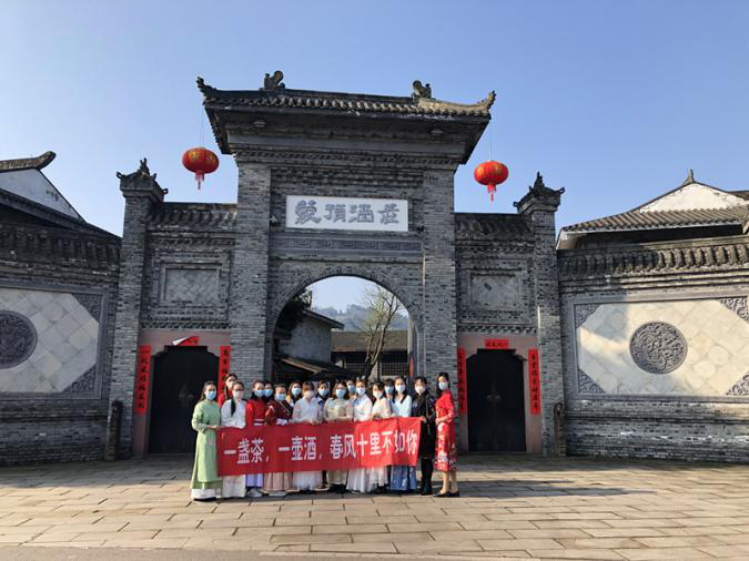 蒙頂皇茶團(tuán)隊(duì)全體女士著盛裝,在接受了公司男同事代表祝福后,整隊(duì)前往蒙頂酒莊,學(xué)習(xí)酒文化、交流個(gè)性化定制業(yè)務(wù)。